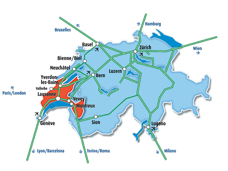 Nichés au cœur de l’Europe, la Région du Léman (canton de Vaud) et sa capitale, Lausanne sont aisément accessibles en voiture via le réseau autoroutier helvétique.